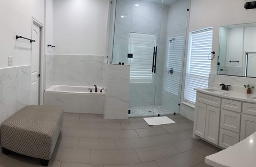 This unique home is basically two houses in one. We have two full sized kitchens, living areas, dining areas, etc. It comfortably sleeps 18. The property is new and full of amenities. We are located within minutes of several restaurants, bars, malls and the following: