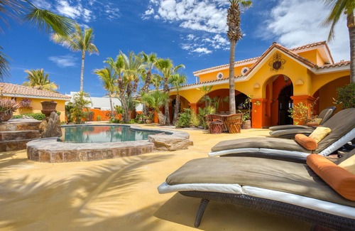 SLEEPS 12! Enjoy the dreamy, magical, private, secure, fully walled-in beachfront estate in the heart of Los Barriles where you can walk to cafes, restaurants, grocery stores and step onto the white sandy beach for a stroll, sea kayaking, kiteboarding, SUP, fishing or swimming. We are super hosts on Airbb and previous Superhosts on VRBO before our listing got hacked (that is why there are currently only a few reviews here) Estate includes 6 bedrooms/6 baths. 3 bedrooms/3 baths in large main Villa, Two NEW separate Casitas/ guest houses, (one 2 bdrm/2 bath w/ kitchenette, one one bdrm/one bath w/ laundry room. The lower Courtyard with lush plants and fountain, pool and spa adjacent to home, large spacious beachfront patio that included fireplace, palapa table, outdoor kitchen and bar.... this is one of the few Beautiful, traditional, fully updated Mexican style beachfront estates located right IN TOWN in the center of Los Barriles. As you enter the gates, you will be greeted by a Lush, incredible courtyard w/fountain. Follow the cascading tile rounded staircase leading up to a relaxing pool and hot tub that has two waterfalls into the beautiful swimming pool. Poolside lounge chairs, tables and chairs for eating, playing games, reading and relaxing. The beach side of the estate contains a patio that spans the entire property with another staircase leading you to the white sandy beach. Enjoy incredible views of the Sea of Cortez as far as the eye can see, a fire table, outdoor BBQ/bar area, lots of seating options and lounge chairs including a traditional round palapa table. Inside you will enjoy amazing furnishings with oversized couches, beautiful bedrooms, flatscreen TV, new kitchen fully equipped for all