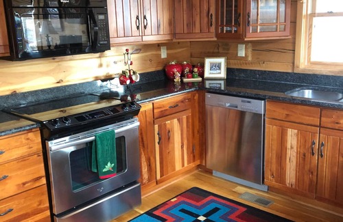 One of a kind cabin that offers 2 bedrooms each with king size beds and luxurious linens. Wrap around decking handmade with mountain laurel!!! Master bedroom also has a day bed for reading or napping. Both bedrooms have wall mounted TV's, and private mountain views. Master bath has granite counters, walk in shower, and also a garden spa tub. Main level bath also has granite counters, walk in shower, and old fashion claw foot tub. Very private real log cabin with wrap around deck with custom crafted spindles made from native mountain laurel. Inviting open floor plan with real wood burning fireplace and we supply firewood. Kitchen has granite counter tops, new side by side refrigerator, stove, microwave, and dishwasher. Conveniently located in the basement is a new washer and dryer. Local art and artifacts tastefully displayed throughout cabin. Very ROMANTIC with mountain sunset views that are never ending. Local hiking trails are within walking distance.