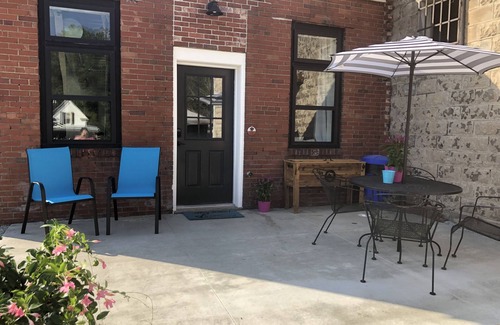The Building is the early Milltown post office. It is fully renovated and every surface brand new. Just 1 block from Cave Country Canoes and steps away from the beautiful Blue River. All one level, 2 private bedrooms and baths. Large open Kitchen and living, sleeps 6 with the sofa beds. The Building has a vintage vibe and brand new comfort. it is features art and furnishings from the river area and is a paddlers dream. Nice outdoor Patio. Down town but quiet and private. Great location for fishing, walks and riding bikes.