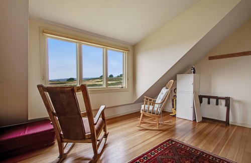 A spiral staircase leads to a beautiful loft upstairs with a queen bed, built-in desk, and a gas wall heater. Two rocking chairs looking out over Mendocino Headlands State Park provide additional spaces to read, talk, doze, or quietly reflect.
