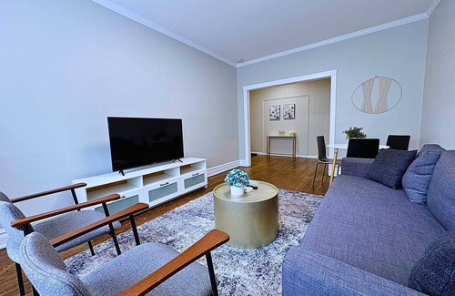 This chic 2BR apartment offers a stylish and comfortable stay with modern furnishings and thoughtful touches. Enjoy a spacious living room, fully equipped kitchen, two cozy bedrooms with queen beds, and a clean, updated bathroom. High-speed Wi-Fi, smart TV, fresh linens, and essentials are included. Located in a lively neighborhood with great dining, shops, and easy public transit access—ideal for both short visits and extended stays.