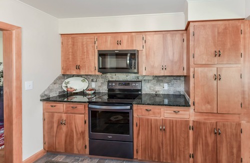 My childhood home was built in the early 1940s and is modest yet comfortable. It sleeps 8. There are 3 bedrooms and a queen sleeper sofa. There are 2 bathrooms. Downstairs there are 2 queen bedrooms that share a hall bathroom. Upstairs is the master with a king bed and private bath. There is a den and living room so kids can game in one room and adults can gather in the other room. For holidays, there is ample room to prepare a meal and eat together in the dining room or spread out on the porch. To me, the best spot is the glassed front porch where the sun streams in and you can enjoy the 180 degree view.