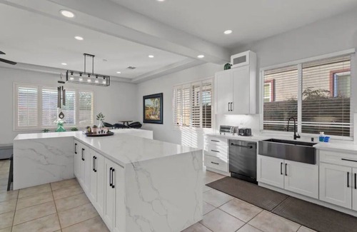This amazing open floor plan is a 4 bedroom with 3 attached bathrooms. Open kitchen into dinning area. All new furniture and paint and this house is awesome for entertainment. New Game room with arcade and 4 real slot machines. We have shuffle board ping pong out side pool side TV and so much more. Terra Lago golf course 2 min drive and so many other golf courses nearby, hiking trails, polo grounds are less than 3 miles. Acusure arena 10 min drive away. Living desert outside Zoo 10 min drive. Cable with movie channels in all of the rooms. Back yard fire place and BBQ for evening entertainment. Mountain View’s and extra large back yard. Read our reviews we never disappoint our guests. We are disability friendly one level all flat pool side 36” wide doors and easy shower access.