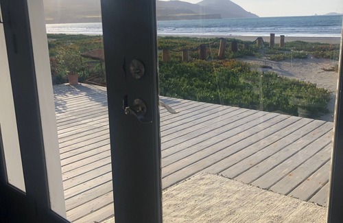 Newly renovated, this elegant house has wide open spaces and water views to relax and watch sunsets and dolfins. Perfect setting for watching the kiddies in the water from the deck. Parking available inside the gate for one vehicle. The beach is 6 miles long. Take a hike and collect shells; a favorite pastime. Our estuary just behind is a protected area with migratory birds. Mountains surround the entire are and the light of Ensenada across the bay is stunning!