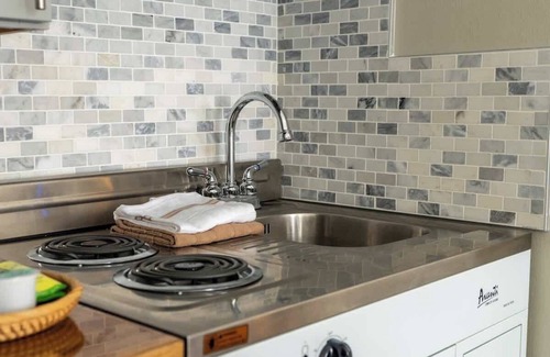 This bachelor unit features a comfortable full-size bed, ensuring a restful sleep after a day of exploring the city. The kitchenette is equipped with all the essentials to prepare light meals or snacks, while ample closet and storage space help keep your belongings organized. Stay entertained with a Roku-equipped 40-inch TV, and enjoy the convenience of 100% cotton linens and towels provided for your stay. A portable air conditioner ensures your comfort, and the building offers access to a laundry room for your convenience.
