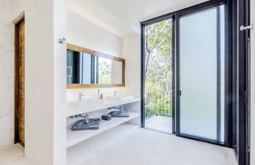 The Villa has a modern design with strong Mayan artistry and high-end amenities, every Bedroom has its own ensuite bathroom and bathtub with super soft quality bed-linens (100% cotton) and pillows for your maximum comfort, there is an abundance of outdoor living space. The 2nd story has an open living area with modern art, custom-designed dining table for up to 12 people, high-ceiling and a fully equipped luxury island kitchen w/5-burner gas stove & oven (stocked with all pots, pans, cooking utensils, blender, food processor, Nespresso coffee maker, toaster oven, on-demand purified water, double sinks), Door-in-Door Refrigerator, freezer, dishwasher, a superior sound system and an astounding outdoor jungle view pool, heated jacuzzi (hot tub), terrace, bbq grill, chaise lounges, etc.