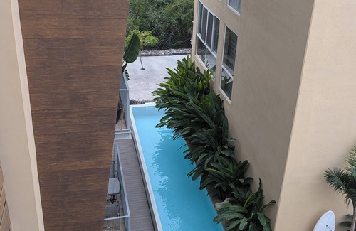 Pool, one flight to amazing roof top views of marina. Patio deck and everything well done down to silverware. Details everywhere. Full cable custom lighting and a concierge that is free ....tipped well. Who will not fail you perfect English and just simply the best person you could know in 100km.