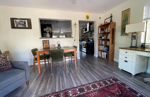 This is an artist's home with unique and friendly works, spacious and relaxing. Back porch with fans, nice yard for bbq and pitfire. Great for work-at-home folks, and makers, with lots of windows, French doors to the backyard, hummingbird feeders, and a natural Arizona landscape that encourages critters like quail, and bunnies. Fox, coyote, and javelina have also been seen in the neighborhood. Gas stove with a lighted hood and great chef's kitchen with full supplies/utensils. TV and fast T-Mobile internet and Google Nest controls for lighting.