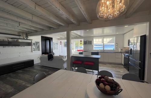 Beautiful, unique year-round beach house on North Pond with water on 3 sides! This modern home meets rustic with a touch of glamour to create a peaceful feel. The gentle white and wood space includes Ikea cabinetry mixed with weathered wood, nickel fixtures, an open floor plan, extra-large windows, and creative details around every corner. Second-story deck with elevated, panoramic views of one of the most beautiful lakes Belgrade Region has to offer.