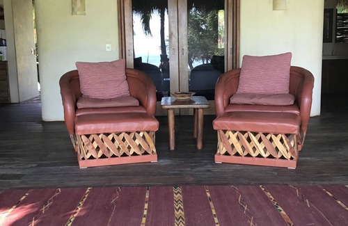 The entire private 1/4 acre beach front property is offered as a single rental. The property is for sale, but even if we get an offer cannot close until March. You will be asked to accommodate showings at convenient times. Showings are rare so very much appreciated. Grand Palapa main house is a true work of art, with exotic hardwoods throughout and genuine thatched roof. Open entertaining area, ceiling fans, and idyllic view of palm shaded garden and sandy beach. Spacious air-conditioned bedroom with king sized bed with lots of down pillows. Oversized bathroom. Full kitchen. Three comfortable areas to gather with two sofa beds and comfortable chairs in living room area, two luxurious lounge chairs in sitting area and dining table for 6. Cooling plunge bath off terrace with views of ocean, garden. Drop down see through screens to protect from rain, wind, sun and keep house cooler. High speed internet.