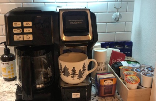We do not have a kitchen, but we do have a kitchenette, complete with a microwave, mini fridge, coffee/keurig pot, hot water kettle, and toaster. Dishes, silverware, and other utensils provided. Dishes and mugs are microwave safe. There is a gas grill outside, for guest use. Please do not bring/use hot plates, instant pots, crockpots or any other type of cookware.