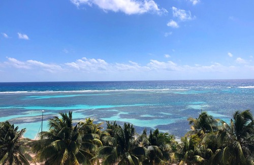 Beautiful and spacious boho chic style suite with a huge private beachfront terrace with spectacular views of the coral reef.