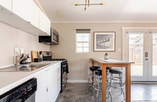 Beautifully restored modern 1-bedroom with lots of natural light and high ceilings. The large master bedroom has a king memory foam mattress and en suite bathroom. Enjoy your morning coffee in the vintage butterfly chairs, or experience quintessential SoCal indoor/outdoor living with the double French doors. Super central location. Quiet and tranquil - perfect spot to work from home or staycation. Gated parking spot included!