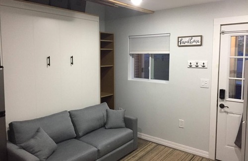 Our unit is ~200 sq ft of function and style. We are proud of all of the unique functional features of our home. It has a full sized shower as well as a queen sized Murphy bed, making small-space living extra comfortable. Can also be rented with the unit next-door, which is separated by a locking pocket door.