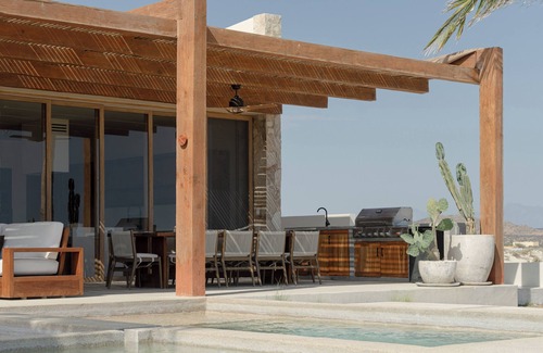 Designed with a blend of minimalist and rustic style, Casa Suna features expansive ceilings, panoramic windows, and curated furnishings. The living room offers plush seating, a TV lounge, and retractable glass doors opening to the terrace. A fully equipped kitchen allows for effortless meal preparation, complemented by a formal dining area and multiple outdoor seating spaces. Each bedroom is a private sanctuary with premium bedding, stylish décor, and access to outdoor areas — from the serene Master Suite with desert views, to versatile bunk rooms perfect for families or groups.