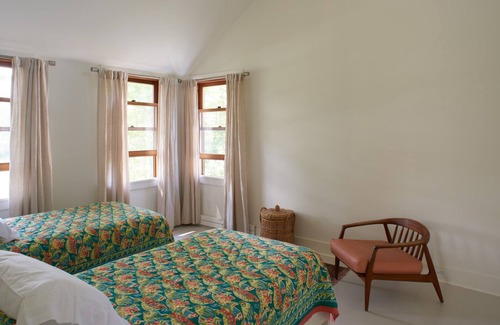 Upstairs are three additional bedrooms – one with a queen bed, one with two twins, and a third with a single twin bed — and a second full bath with a shower and tub.