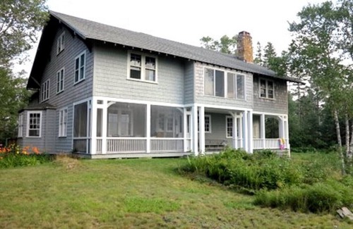 This 1917 rustic house was built by the owners' great-grandparents on a rocky promontory in Penobscot Bay with views of the Camden Hills. It is a large house designed for family gatherings; it has big, beautiful proportions, stone fireplace, piano, 9 BR 4.5 bathrooms, huge kitchen with 3 fridges. The dining room seats 12 easily. Sunset views extraordinary. Parking for 3 cars. Old quaint fixtures, many porches, drafty and cool in summer, deep water dock.