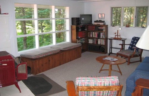 The cozy Sandpiper cottage has an open floor plan, with well equipped kitchen and cooking island. The oven and stove-top are electric. The large dining table connects the kitchen with a spacious living room and each area has spectacular ocean views. The inviting living room has a wood stove, a well-stocked library, satellite TV, DVD player and CD stereo. The cottage has two cozy bedrooms each with double beds, a bunk-room with over/under single bunk beds, and a full bath. The spacious front deck offers an additional relaxing or entertaining area, and the large lawn provides space for family outdoor games and activities.