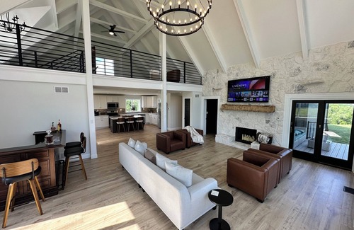 Serene hilltop retreat with panoramic views and refined comfort. Perfect for families, groups, or wedding parties, White Pines Lodge blends nature with upscale amenities. Open-plan living with floor-to-ceiling windows and a grand stone fireplace. Fully equipped with premium appliances in a spacious kitchen big enough to host large gatherings or cook for several families. Luxurious king master with seating area to relax in your own wing of the house. Spa-like master en suite has a 6’x12’ wet room equipped with a soaking tub, double rainfall shower heads, body sprayers, hand wands and a spacious double vanity. Two additional king bedrooms, one of which has a fireplace. Loft has plenty of room with two queen beds and a seating area. Washer and dryer with supplies. Indoor home bar with large living room, great for entertainment, Large deck, fire pit, and smart TVs in all bedrooms. Close proximity to wineries, breweries, and a venue nearby.