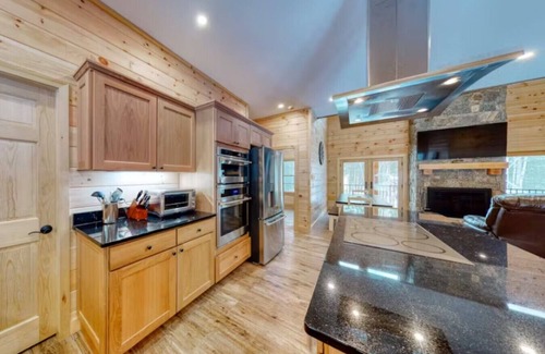 Step inside this luxurious cabin and be greeted by an interior that perfectly balances rustic charm with modern comfort. The open-concept living space, with its soaring ceilings and towering stone fireplace, is the perfect spot to gather with your crew after a day of adventure.